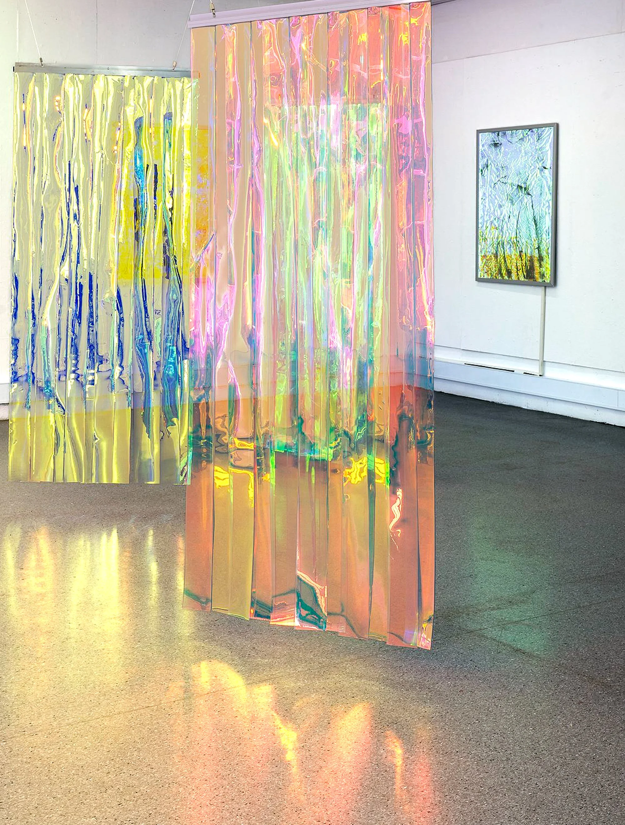 Janet Jeffs, Installation Dichroic Curtain/Unstable Ground: exploration of the contemporary sublime in the natural world, 2025, installation view. Image courtesy Brenton McGeachie.