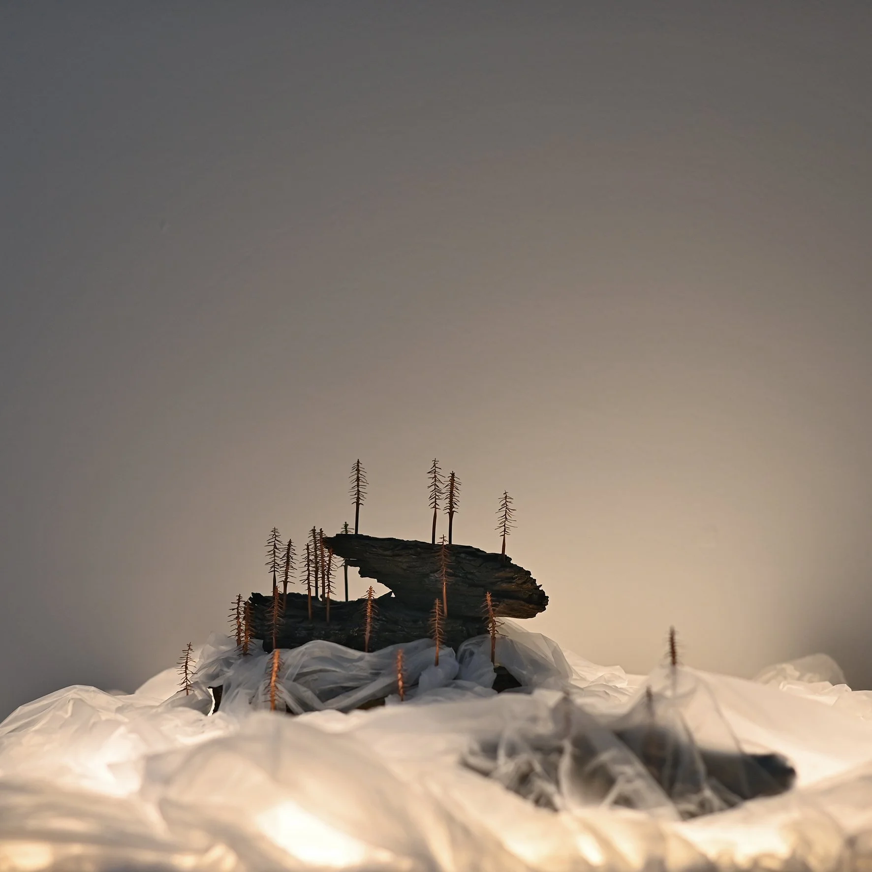 Fog (2021) is an installation of four miniature forests. The landscape, a multi-piece sculpture of woodlands, is created from stacked radiata pine bark and carefully hammered copper. Plastic film wraps around these forests, concealing some copper trees and pine grounds. The use of plastic – a material that envelopes and suffocates – is direct visualisation of a fog’s ominous presence, and also covers the light box that the work is displayed on. Arranged all together in a square cross or positioned separately, the four light boxes illuminate Fog from underneath and highlight the plastic film’s subtle opacity.